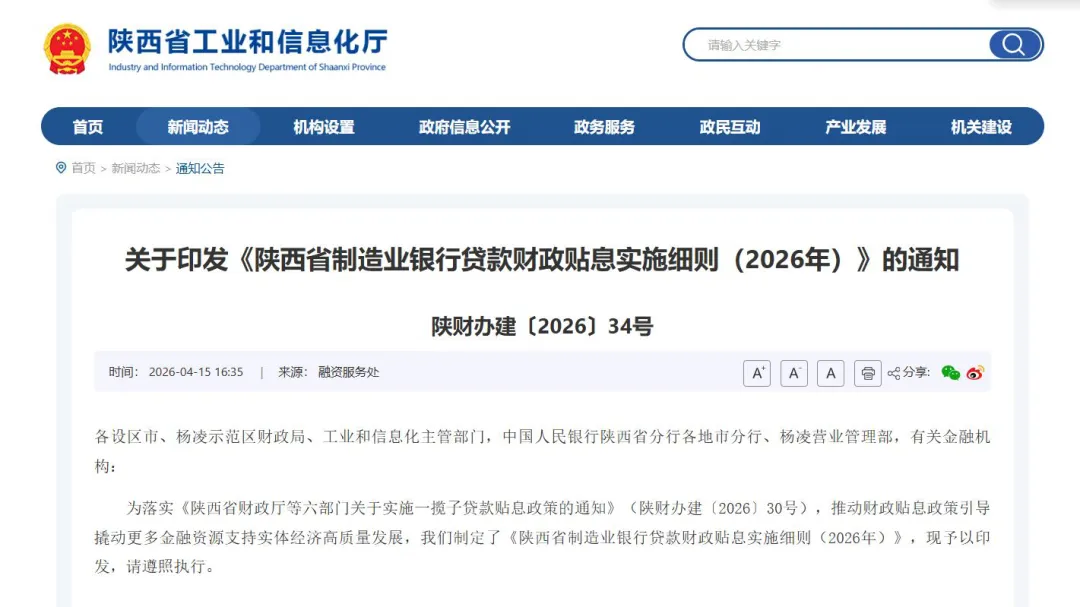 为进一步降低制造业企业融资成本,支持实体经济发展,陕西省工业和信息化厅、省财政厅及中国人民银行陕西省分行近日联合印发《陕西省制造业银行贷款财政贴息实施细则(2026年)》(下文简称《细则》)。《细则》是我省一揽子贷款贴息政策的重要组成部分,旨在通过财政资金撬动金融资源,精准支持省内制造业企业进行设备更新、技术改造与科技研发。