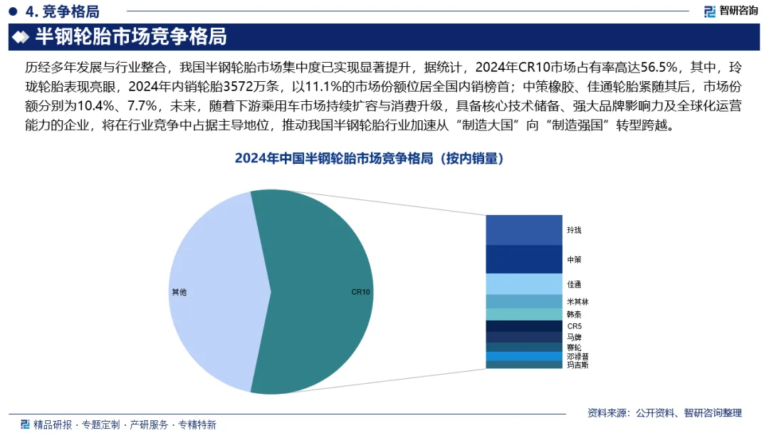 市场竞争格局:历经多年发展与行业整合,我国半钢轮胎市场集中度已实现显著提升,据统计,2024年CR10市场占有率高达56.5%,其中,玲珑轮胎表现亮眼,2024年内销轮胎3572万条,以11.1%的市场份额位居全国内销榜首;中策橡胶、佳通轮胎紧随其后,市场份额分别为10.4%、7.7%,未来,随着下游乘用车市场持续扩容与消费升级,具备核心技术储备、强大品牌影响力及全球化运营能力的企业,将在行业竞争中占据主导地位,推动我国半钢轮胎行业加速从“制造大国”向“制造强国”转型跨越。