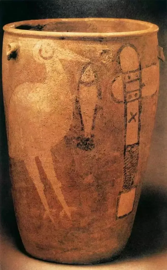 陶质彩绘,器高47厘米、口径32.7厘米。陶缸绘有鹳鸟衔鱼,旁边竖立一件石斧的画面。