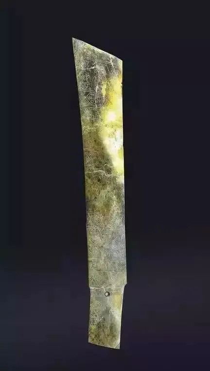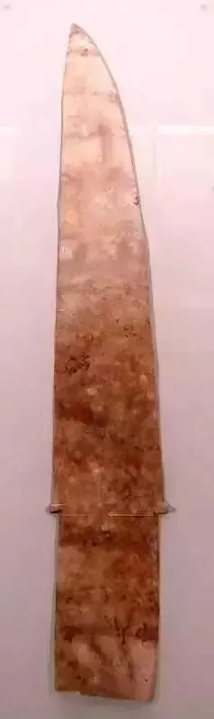 属商代前期,1974年黄陂盘龙城李家嘴三号墓出土。玉质仪仗器,长94厘米、宽14厘米、厚仅1厘米,堪称“玉戈之王”。现藏湖北省博物馆。