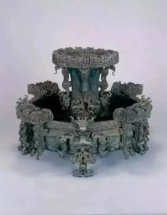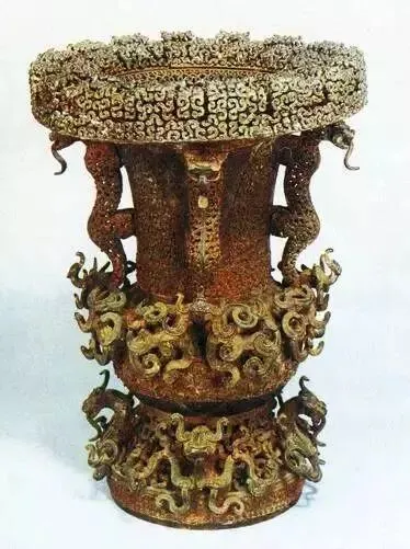 属春秋中期,1978年河南淅川下寺出土。这是我国迄今发现用失蜡法铸造的时代最早的铜器,其工艺精湛复杂,令人叹为观止。现藏河南博物院。