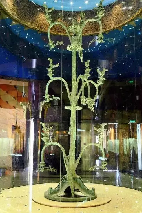 属商代,1986年四川广汉三星堆二号祭祀坑出土。土青铜神树由树座和树干两部分组成,树干高384厘米、通高396厘米。从造型来看,该青铜神树应是代表东方的神木“扶桑”。