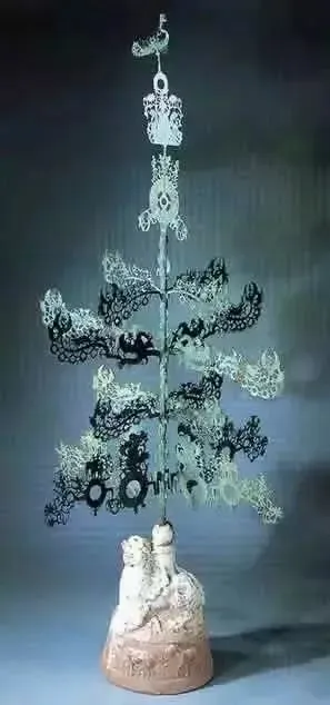 属东汉,1990年四川绵阳何家山二号汉墓出土。基座为红陶质,树用青铜浇铸。