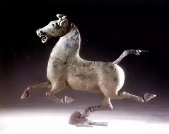 属东汉。铜奔马又名“马踏飞燕”、“马超龙雀”。按古代相马经中所述良马的标准尺度来衡量铜奔马,几乎无一处不合尺度,故有人认为它不仅是杰出的艺术品,而且是相马的法式。现藏甘肃省博物馆。