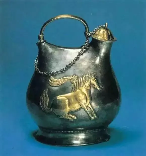 属唐代。此壶仿游牧民族的皮囊式水壶造型。令人称奇的是在壶身,壶腹两侧面用模具冲压舞马图,突出于壶面的、金色的、奇异的马。据考证,这是一匹正在舞蹈的马。现藏陕西省历史博物馆。