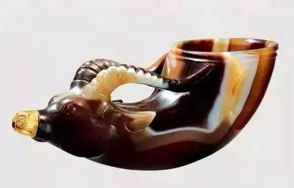 唐代,1970年西安南郊何家村出土。又称镶金兽首玛瑙杯,通高6.5厘米,长15.6厘米,口径5.9厘米。这件国之重宝,象征着财富和权力,是一件高贵的艺术品,同时它也很可能是中西亚某国进奉唐朝的国礼,意义非同一般,是在东西方文明碰撞的火花中诞生的一件重要文物。现藏陕西省历史博物馆。