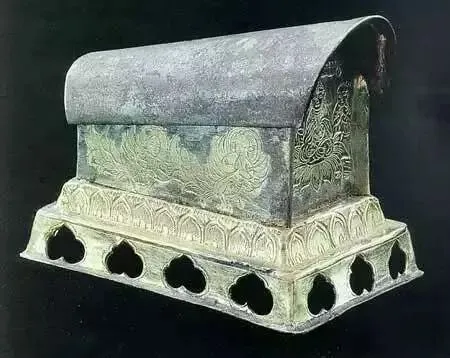 唐代,法门寺地宫出土。塔内盛放鎏金伽陵频迦鸟纹银棺一枚,第四枚佛指舍利就在鎏金伽陵频迦鸟纹银棺的棺盖内。