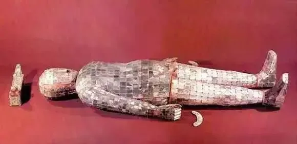 西汉,1968年河北满城中山靖王刘胜墓出土。整套“玉衣”共用玉片2498片,金丝约1100克。另外,颈下有玛瑙珠48颗,腰部出玉带钩。现藏河北省博物馆。