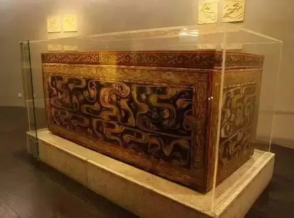 西汉,长沙马王堆一号墓出土。棺椁用巨大的木板制成,置于墓底正中。