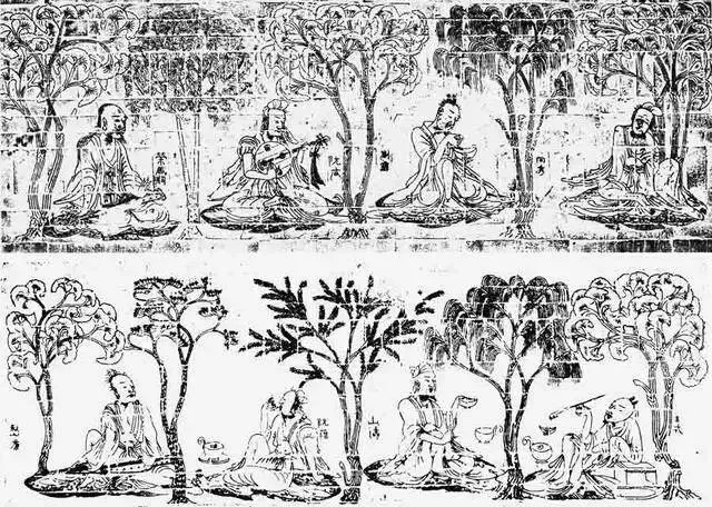 南朝。由300多块古墓砖组成,出土时分东西两块,一块为嵇康、阮籍、山涛、王戎四人,另一块为向秀、刘伶、阮咸、荣启期四人。八人席地而坐,或抚琴啸歌,或颔首倾听,人物之间以树木相隔,完美地体现了对称美学。
