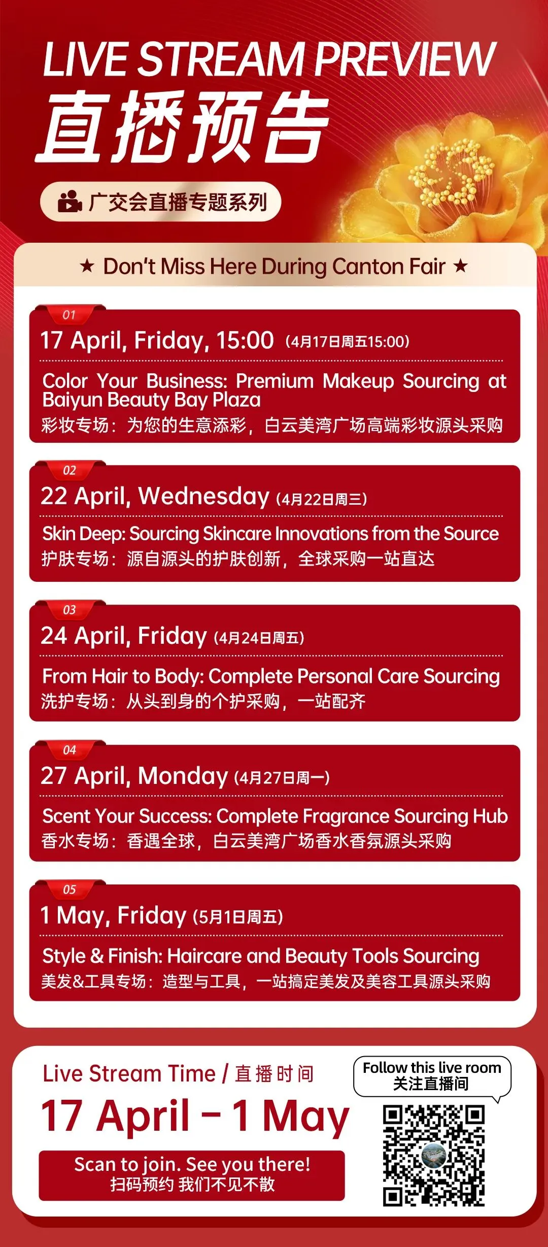 During the Canton Fair, we have specially curated 5 live streaming sessions in English, using a “category-focused + live walkthrough” format to take global buyers on a virtual tour of Baiyun Beauty Bay Plaza, the global cosmetics purchasing center, so you can experience its scale, product variety, and supply chain strength first-hand.