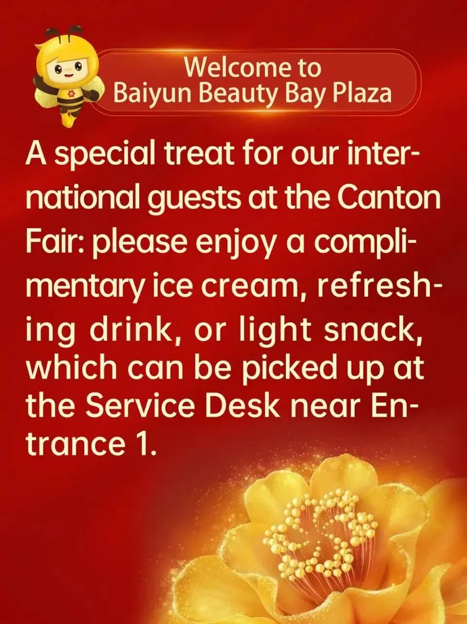 广交会期间,白云美湾广场为远道而来的国际客商准备了特别福利:每位国际客商可免费获得冰淇淋一支、清凉饮料一杯或精美礼盒一份!