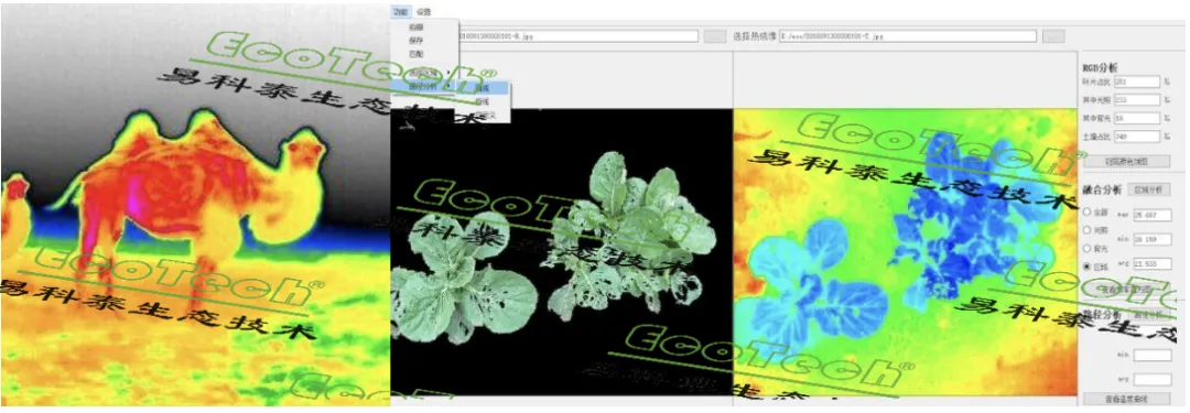 Thermo-RGB 一体式红外热成像仪采用易科泰研发的红外热成像与 RGB 成像融合分析技术,可实时精准 ROI 分区分析和图像分割,广泛应用于植物表型分析、植物干旱胁迫检测与抗性筛选等,及动物形态体温生理变化,非接触非损伤检测动物健康与形态测量。