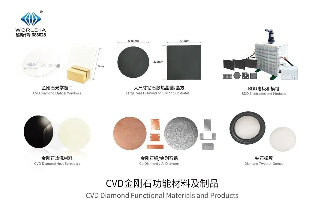 整体解决方案:从传统汽车到新能源汽车,无论是动力系统、传动系统、转向系统、制动系统等核心零部件生产制造的降本增效,还是新能源汽车三电系统、底盘系统等零部件的高效加工,沃尔德均可为客户提供高精高效、高性价比的整体解决方案。CVD金刚石功能材料及制品:此外,公司重点展示了以CVD金刚石功能材料为核心的第二、第三增长曲线产品体系,涵盖金刚石热沉材料、金刚石铜/金刚石铝复合材料、大尺寸金刚石散热晶圆/晶方、BDD(硼掺杂金刚石)电极及电解模组、钻石振膜及金刚石光学窗口等系列产品。相关产品面向热管理、电化学处理、声学器件及光学窗口等应用方向,可为电子器件散热、电化学水处理、高端声学系统及光电器件等领域提供多元化材料解决方案。