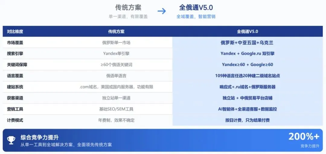 全俄通19年专注于为中国B2B企业出海提供搜索引擎营销一站式整合解决方案,以领先的搜索算法、人工智能、大数据、数字营销和社交营销技术已为5000+外贸企业提供了外贸独立站建设、Yandex出海营销服务、国外社交网络推广、AI大数据获客等服务。
