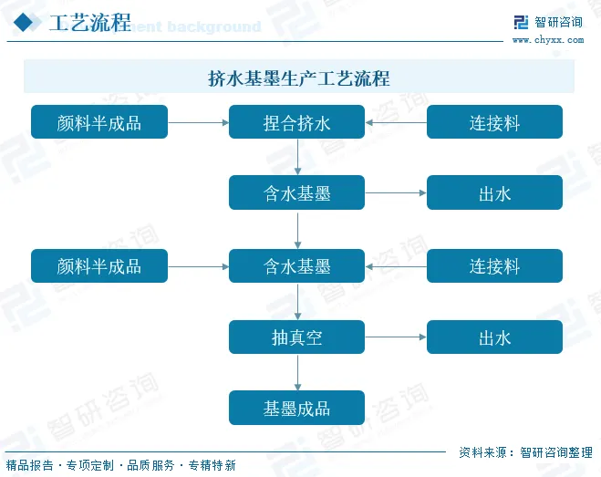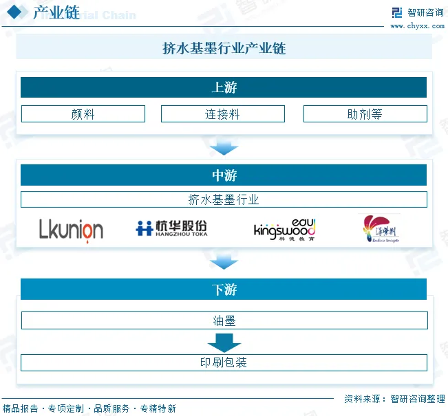 从产业链来看,挤水基墨行业上游原材料包括颜料、连接料、助剂等;中游是指挤水基墨的生产制造;下游是指油墨行业,并最终应用到印刷包装市场,具体包括食品、饮料、医药、卷烟、日化用品等快速消费品的包装印刷,以及出版物、商业广告和标签标识的印刷。