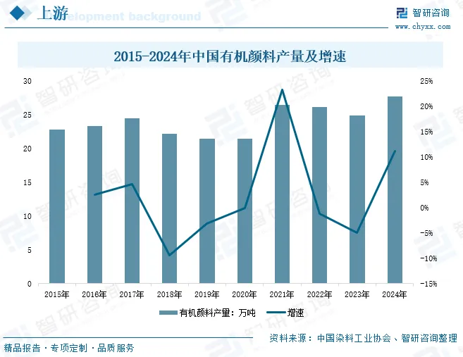 有机颜料是挤水基墨的核心着色原材料,也是决定油墨色彩表现力、视觉效果与应用适配性的关键组分。有机颜料产业发展至今已有100多年的历史,过去欧美国家长期占据主导地位,从上世纪80年代以后,全球化使得有机颜料生产装置逐步向亚洲转移,欧美等国产量逐步下降。目前有机颜料主要生产地区包括中国、印度、欧盟地区、美国、日本等。近年来,我国已成为世界上重要的有机颜料生产国,拥有有机颜料的生产厂家近70家,我国有机颜料产量连续多年位居世界第一。数据显示,2015-2024年中国有机颜料产量较为波动,其中2015-2017年有机颜料产量逐年上涨。2018-2019 年,受环保政策、国际贸易关系等因素影响,我国有机颜料产量略有下降。2021年中国有机颜料产量快速上涨,达到26万吨,这与2020年3月20日起我国将有机颜料及制品的出口退税率提高至13%有较大关系。出口退税率的提高增强了我国有机颜料在国际市场上的竞争力,提高了企业的生产积极性。2022-2023年中国有机颜料产量又逐渐下降,但2024年又逐渐恢复,同比上涨11.2%至27.7万吨。