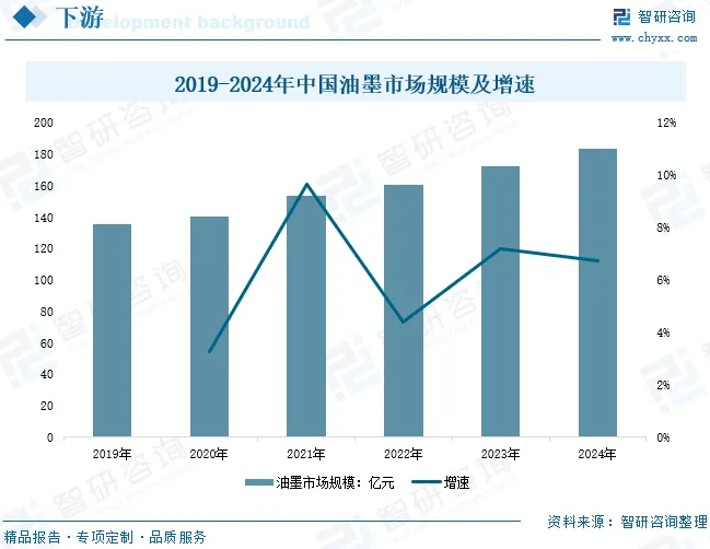 油墨是挤水基墨主要应用领域。油墨是一种由连接料、色料和助剂等组成的用于印刷的粘性胶状流体,可广泛用于包装、印刷领域。近年来,随着国民经济的持续增长和下游包装、印刷行业的发展,我油墨市场的需求不断增加,从而推动其市场规模持续增长。数据显示,2024年中国油墨市场规模达到183.74亿元,同比上涨6.7%。预计未来随着UV油墨和水性油墨等环保型油墨在食品包装、药品标签等领域的应用不断增加,以及电子行业中印制电路板行业快速发展带动UV印刷电路板油墨的需求增加、新能源汽车行业景气快速增长带动汽车油墨需求增长,我国油墨市场规模仍将保持较快增速。而随着油墨市场的快速发展,对上游挤水基墨需求也随之不断扩大,进而带动挤水基墨行业的发展。