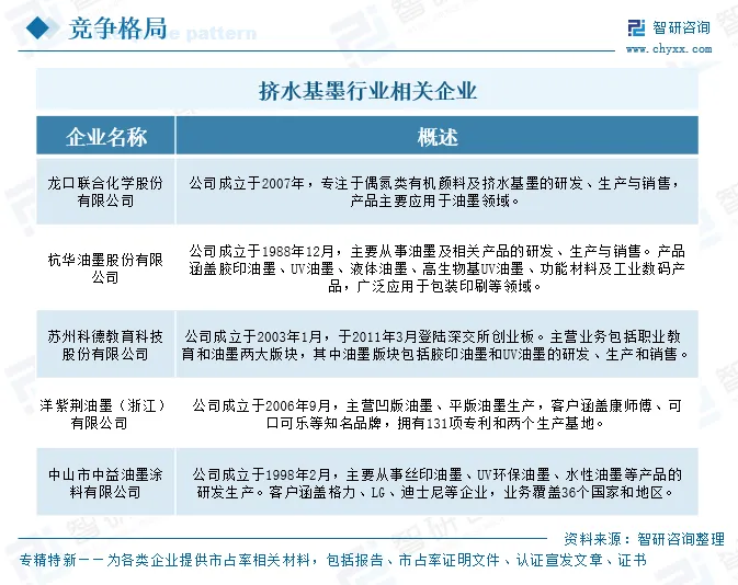 从竞争格局来看,目前,我国挤水基墨行业企业可分为有机颜料企业和油墨企业,主要包括龙口联合化学股份有限公司、杭华油墨股份有限公司、苏州科德教育科技股份有限公司、洋紫荆油墨(浙江)有限公司等。其中,龙口联合化学股份有限公司是国内大型有机颜料企业中具备挤水基墨规模生产能力的企业,拥有3000吨挤水基墨产能。