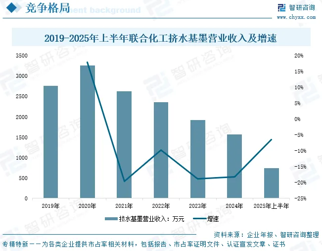 龙口联合化学股份有限公司成立于2007年,专注于偶氮类有机颜料及挤水基墨的研发、生产与销售。在挤水基墨方面,公司是国内大型有机颜料企业中具备挤水基墨规模生产能力的企业,生产经验丰富,为油墨企业采购提供了更多选择,并解决了中小型油墨企业挤水基墨生产规模受限、废水处理能力不足、粉尘污染等一系列问题。此外,公司作为颜料企业进行挤水基墨生产,生产过程更贴近颜料生产工序,对颜料在连接料中的分散性等诸多生产细节的把握更加到位。经过多年的发展,公司拥有稳定的用挤水基墨客户群体,并不断拓展新客户。2025年上半年公司挤水基墨实现营业收入741.26万元,同比下降6.55%。