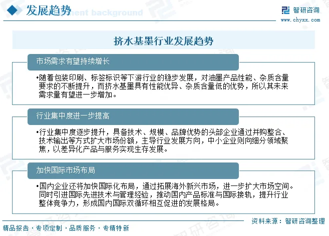 含量要求的不断提升,而挤水基墨具有性能优异、杂质含量低的优势,所以其未来需求量有望进一步增加。其次,行业集中度逐步提升,具备技术、规模、品牌优势的头部企业通过并购整合、技术输出等方式扩大市场份额,主导行业发展方向,中小企业则向细分领域聚焦,以差异化产品与服务实现生存发展。此外,国内企业还将加快国际化布局,通过拓展海外新兴市场,进一步扩大市场空间。同时引进国际先进技术与管理经验,推动国内产品标准与国际接轨,提升行业整体竞争力,形成国内国际双循环相互促进的发展格局。