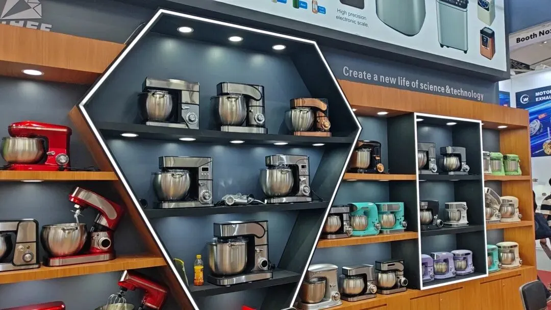 本次广交会现场,SHINECHEF展位以原木质感与科技感结合的设计打造沉浸式体验空间,整齐陈列的台式厨师机、多功能和面机、专业料理设备等产品,凭借多样色彩选择、精致工艺细节与核心性能优势,吸引了来自全球各地采购商的驻足咨询。从经典不锈钢款到马卡龙色系时尚款,从家用小型设备到商用专业机型,完整的产品矩阵全面覆盖不同市场需求,充分展现了品牌在厨房电器领域的全场景解决方案能力。
