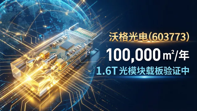 沃格光电,是国内玻璃基板打孔加工的龙头,技术特别硬,现在一年能生产10万平米,2026年计划扩大产能,其1.6T光模块玻璃基载板已完成小批量送样,聚焦高端光模块领域,目前正推进客户验证。