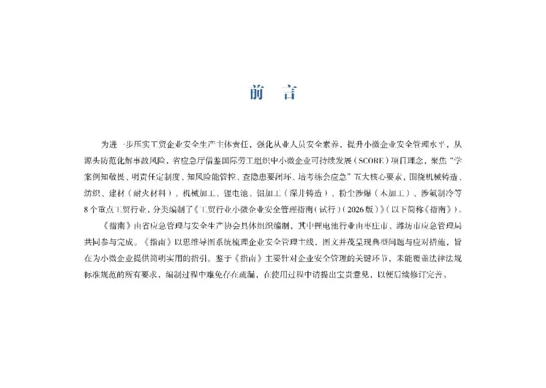 为进一步压实工贸企业安全生产主体责任,强化从业人员安全素养,提升小微企业安全管理水平,从源头防范化解事故风险,省应急厅借鉴国际劳工组织中小微企业可持续发展(SCORE)项目理念,聚焦“学案例知敬畏、明责任定制度、知风险能管控、查隐患要闭环、培考练会应急”五大核心要素,围绕机械铸造、纺织、建材(耐火材料)、机械加工、锂电池、铝加工(深井铸造)、粉尘涉爆(木加工)、涉氨制冷等8个重点工贸行业,分类编制了《工贸行业小微企业安全管理指南(试行)(2026版)》(以下简称《指南》)。《指南》由省应急管理与安全生产协会具体组织编制,其中锂电池行业由枣庄市、潍坊市应急管理局共同参与完成。《指南》以思维导图系统梳理企业安全管理主线,图文并茂呈现典型问题与应对措施,旨在为小微企业提供简明实用的指引。鉴于《指南》主要针对企业安全管理的关键环节,未能覆盖法律法规标准规范的所有要求,编制过程中难免存在疏漏,在使用过程中请提出宝贵意见,以便后续修订完善。