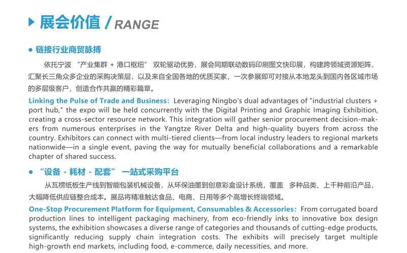 2026宁波瓦楞彩盒印刷包装产业博览会将于4月23日-25日在宁波国际会展中心举办。本届展会将以“科技智能·印领未来”为主题,集结优质设备制造商、材料供应商与技术创新企业,打造浙江地区印刷包装行业标杆盛会。继上届展会成功举办并成为长三角包装印刷产业风向标之后,本届展会全面升级,聚焦智能化制造、绿色低碳与数字化融合,深度呈现高端瓦楞、彩盒印刷及包装设备、数码印刷设备等产业链的前沿解决方案。