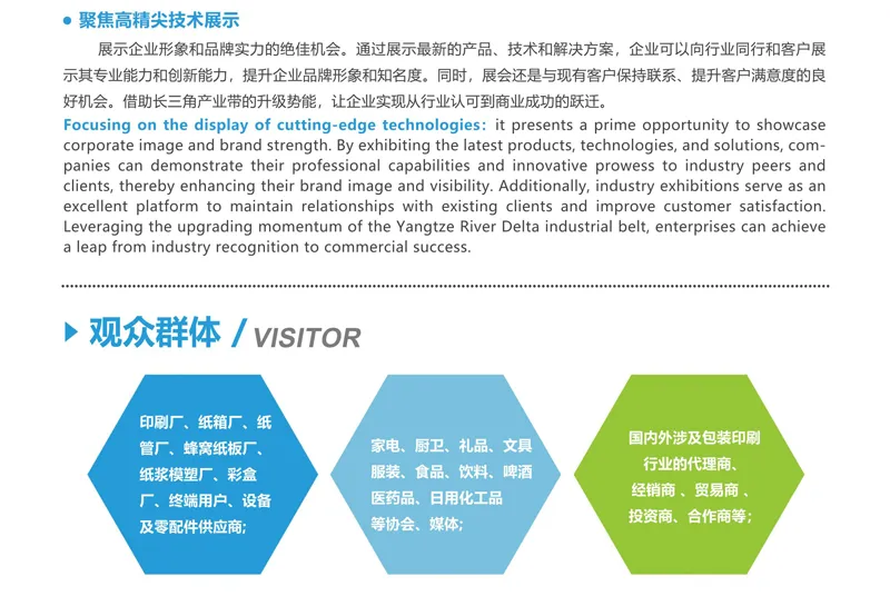 1)印刷包装设备展区:糊盒机、制袋机、裱纸机、压痕机、开槽机、切角机、钉箱机、捆扎机、堆码机、智能化机器人覆膜、上光、烫压、模切、分切、纵切、装订等设备