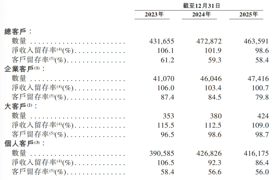 营收端,公司整体营收保持增长,但增速逐步放缓,受房地产与家装行业整体下行影响,核心业务扩张空间受限。作为 SaaS 企业核心指标,客户留存率持续下滑:总客户留存率从 2023 年 61.2% 降至 2025 年 58.4%;净收入留存率由 106.1% 跌至 98.6%,跌破 100% 警戒线,意味着存量客户收入贡献已出现收缩。