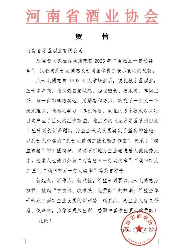 新起点,新作为,新成就。希望贵司要以武云龙同志为榜样,掀起“学技术、攻难关、比贡献”的热潮;希望全体干部职工面对企业发展的新形势、新挑战,树立主人翁责任感、使命感,为豫酒更加出彩、香飘中国作出更大的贡献!