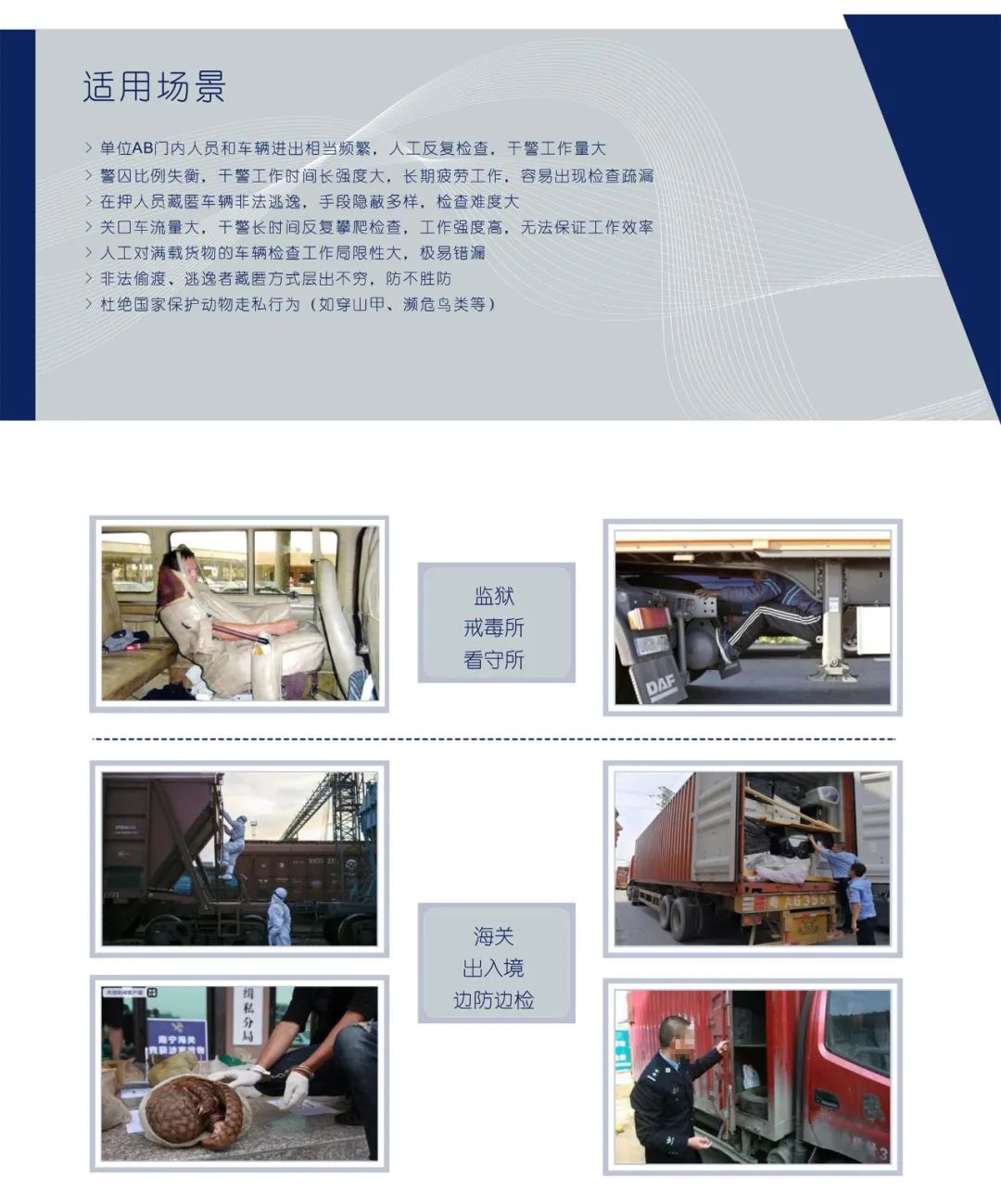 通过吸附在受检车辆上的“微型芯片传感终端”采集车内由生命体征带来的细微颤动(如:心跳、呼吸、脉搏、体动等),运用系统算法对其进行智能分析, 判断出车内是否有藏匿生命体,大幅度提升干警在车辆安全检查中防逃逸、防偷运的工作效率。