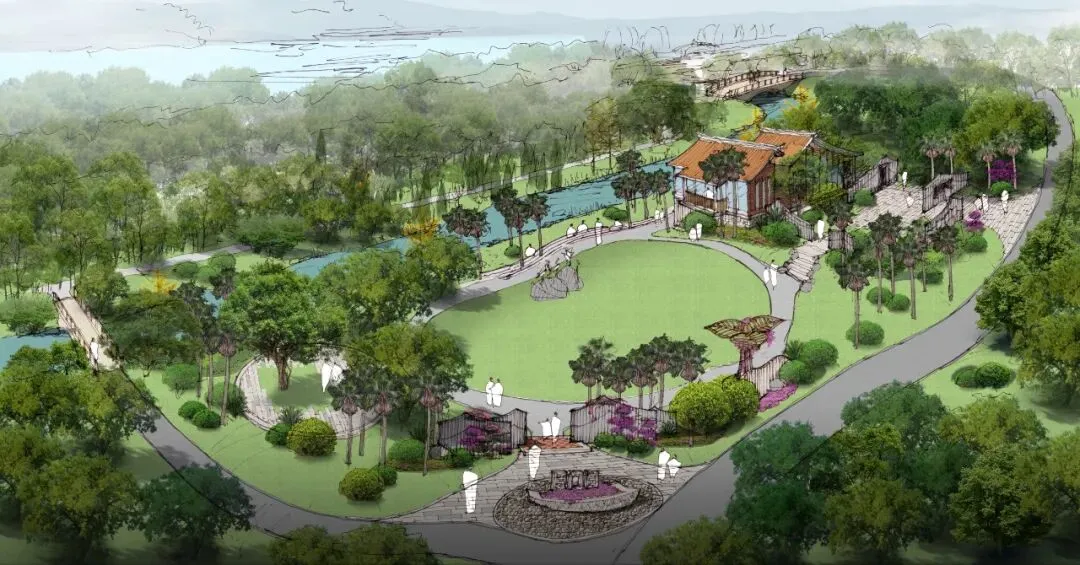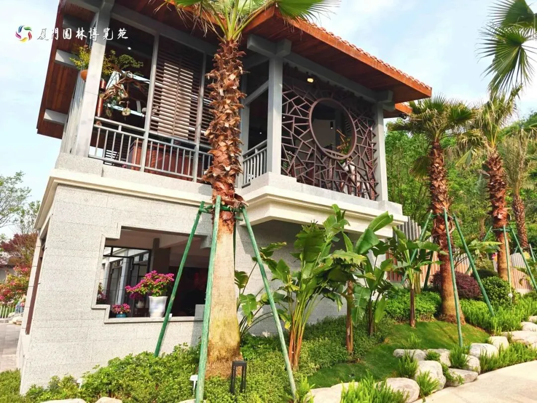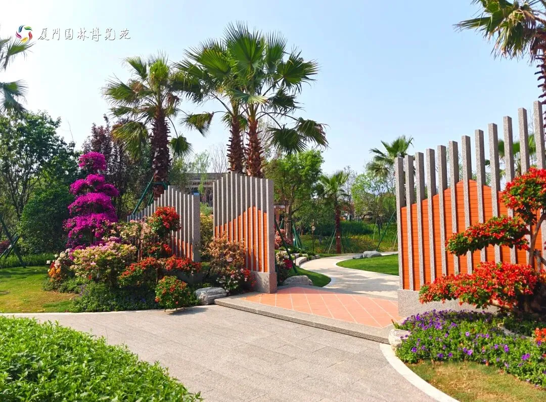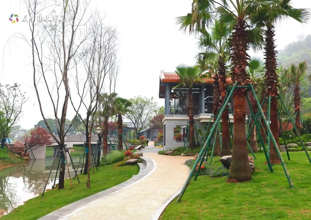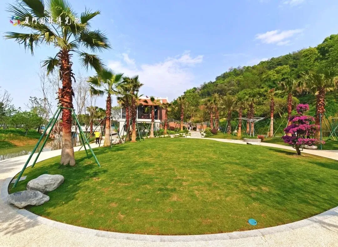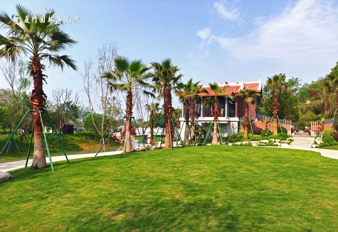 厦门园采用“一轴五区一环”布局,分为入口展示区、草坪棕榈区、寻根主题区、休闲观湖区和庭院花木区,以环形步道串联全域,步移景异。