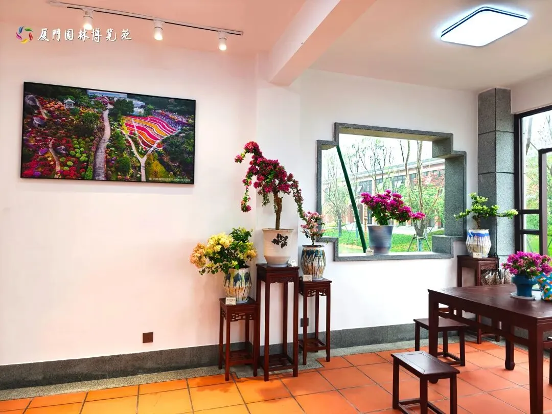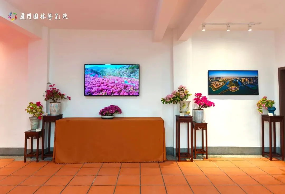 一层通过展板、视频展播和风景画,结合20余盆精品三角梅盆景,集中展示厦门市生态园林城市风貌和高颜值生态花园之城的建设成果。
