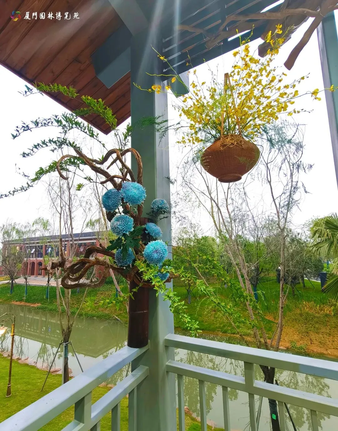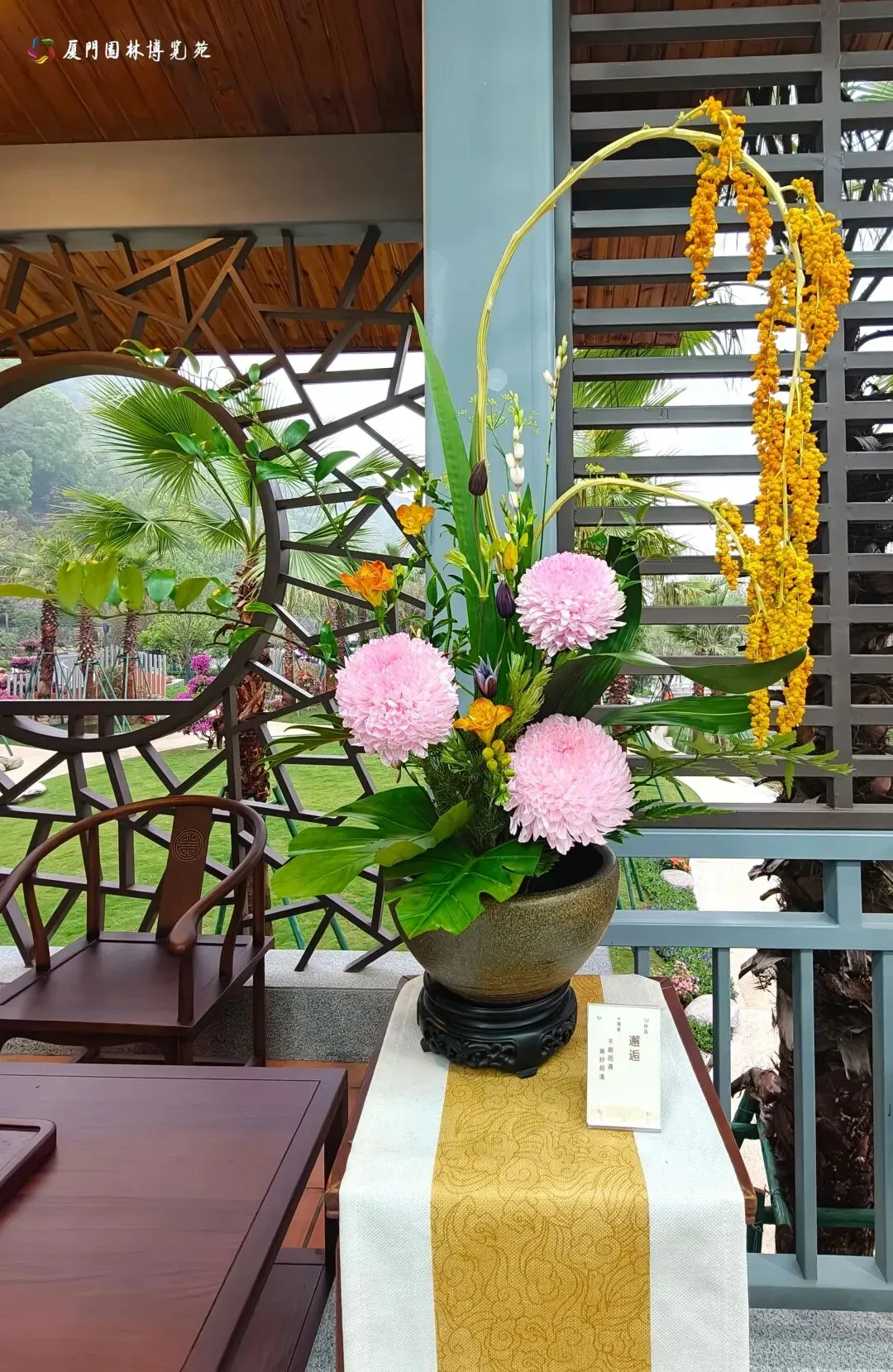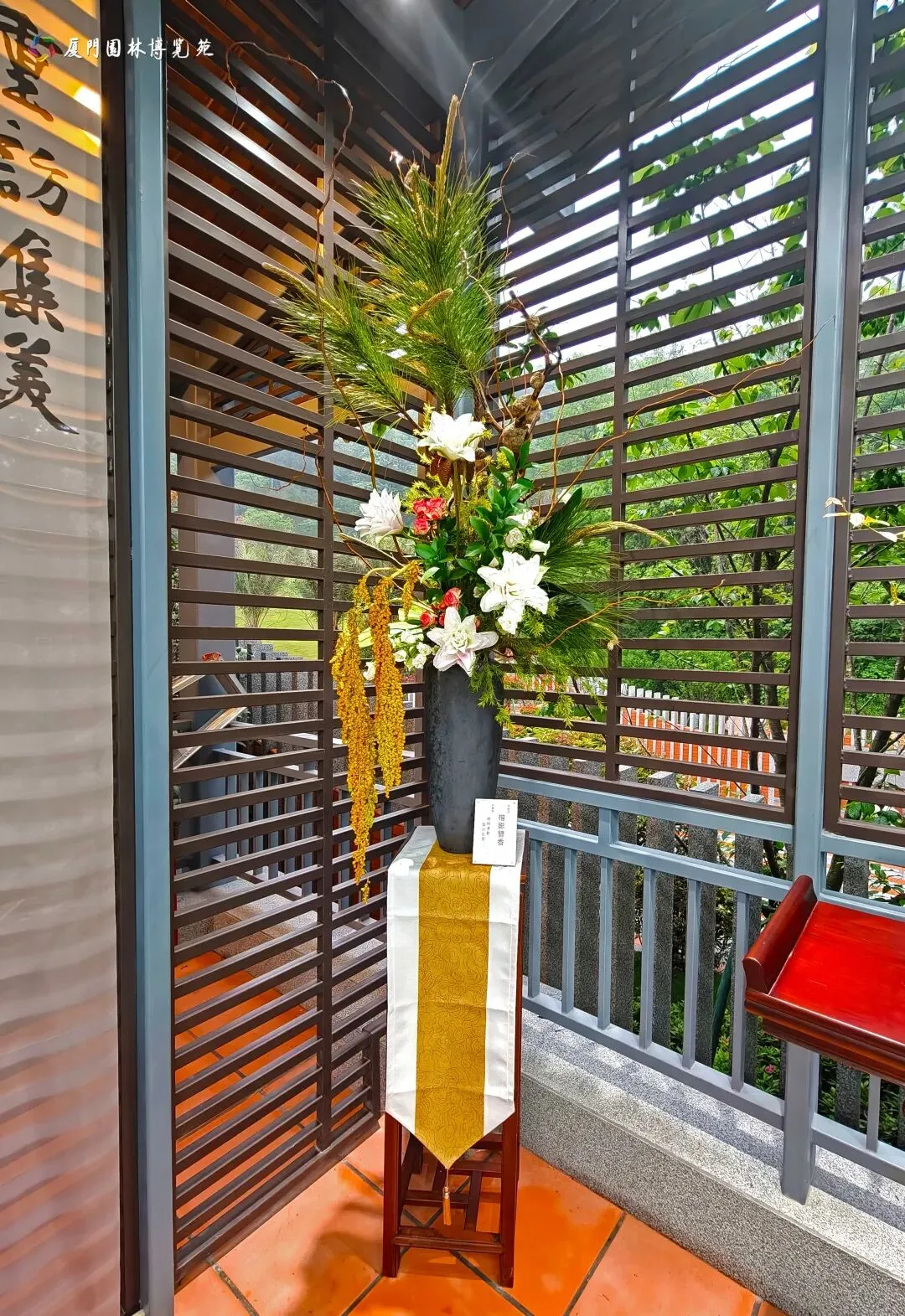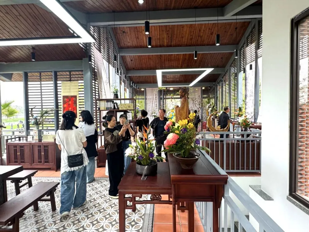 二层以“花栖古厝,鹭岛雅集”为主题,展示精美插花花艺作品,并设有茶席。花香伴茶香,凭栏可览水系与园景,尽享闽南雅致生活意趣。