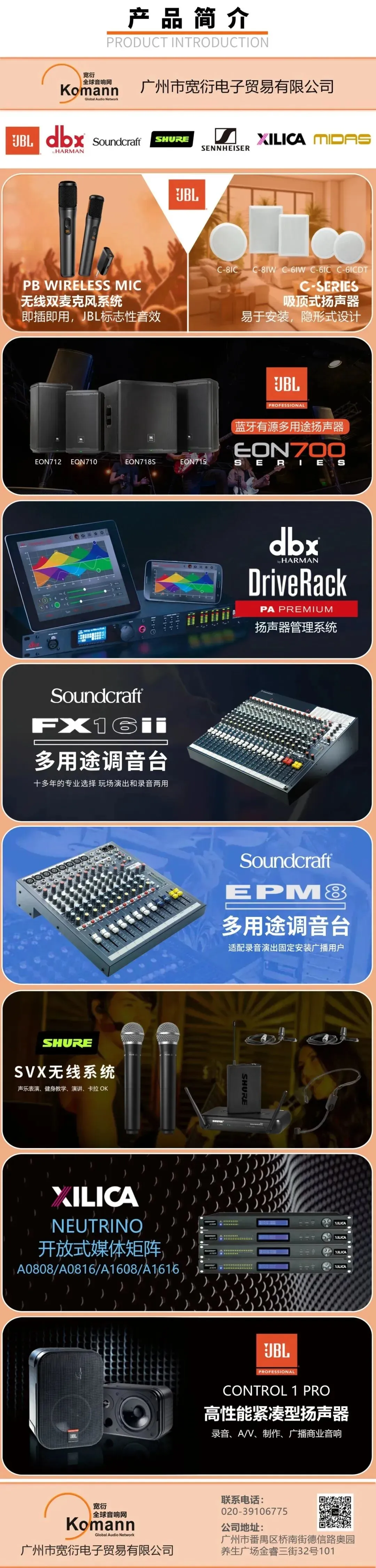 聚焦移动商用扩声需求, 重点主推 JBL EON700 系列有源音箱套装,搭配A&H专业调音台、无线手持话筒:
