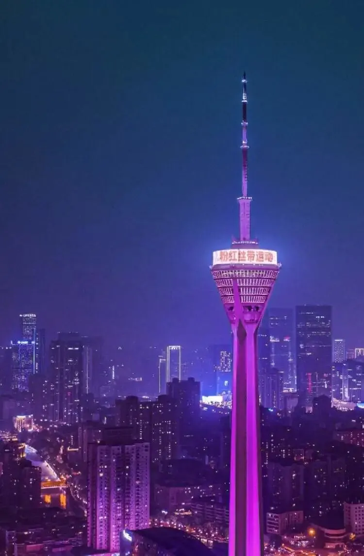 成都天府熊猫塔为“粉红丝带运动“点亮
