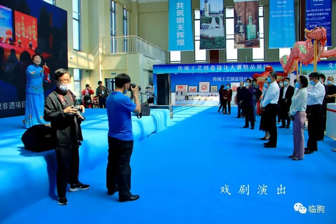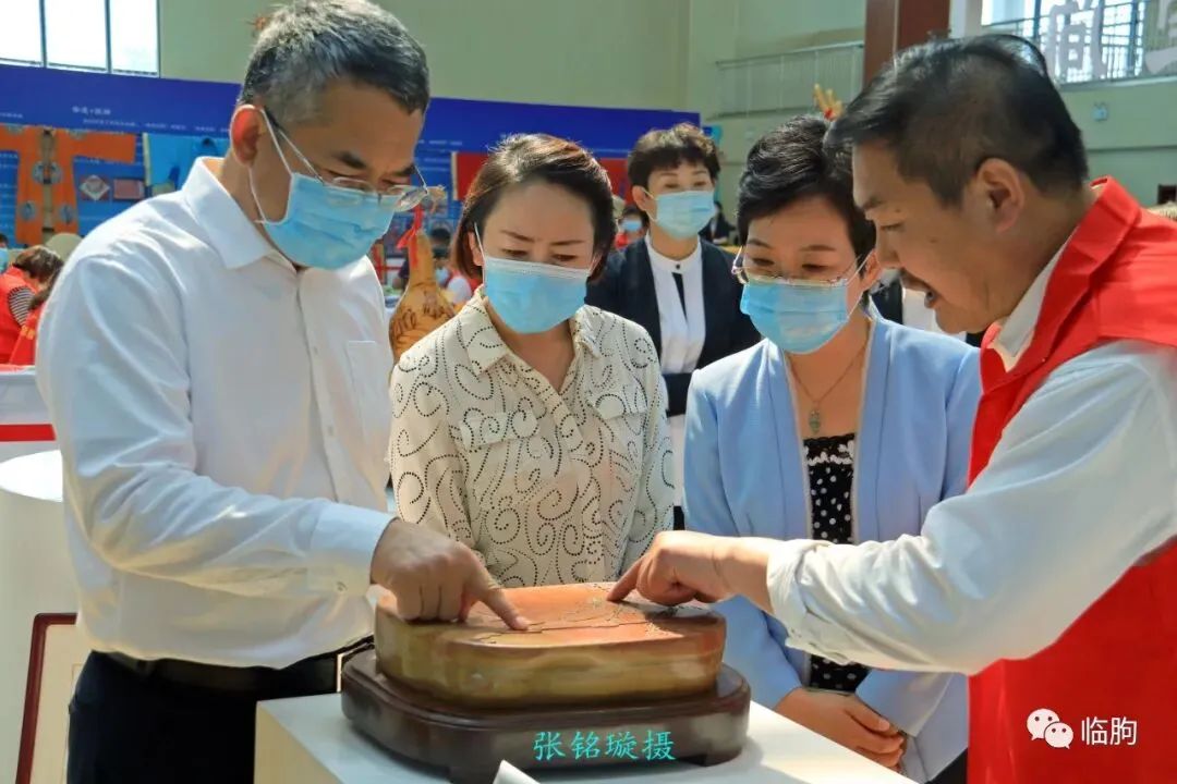 9点24分,临朐县委书记杜建华、临朐县长刘艳芳在县委常委、宣传部长黄芳的陪同下,来到了全民健身中心的“临朐县第二届传统工艺(非遗)博览会”二楼展厅,他们是参加博览会“客人中的贵客”:因为他们既是参观非遗传统工艺的普通客人,又是鼎力支持非遗工作的领导!他们首先来到红丝石工艺品雕刻展示区,这里的大块红丝石被制作成红丝砚,砚台底面都刻有精美的诗文。每一块红丝砚都是一个妙手天成的艺术佳作。杜书记、刘县长、黄部长详细听取了制作艺人的介绍,并予以高度赞赏。9点28分,红丝砚展区西边的民间舞台正在演出临朐乡土戏,杜书记、刘县长、黄部长,还有文旅局的领导,来到舞台前边,成为第一批恭谨的观众。9点35分,杜书记来到手绘年画现场,仔细观看手绘年画非遗传承人一笔一划的工笔画。其中李志君是年龄较长、手艺最精的年画手绘艺人。杜书记拿起一张画,仔细端详,并不时地向艺人们请教。9点42分,杜书记、刘县长来到草编手工艺品展区,面对玉米裤编成的提篮和蒲团、柳条编成的笸箩、箢子,他们分辨出了各地的不同叫法。