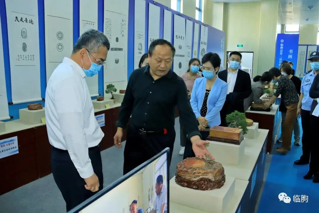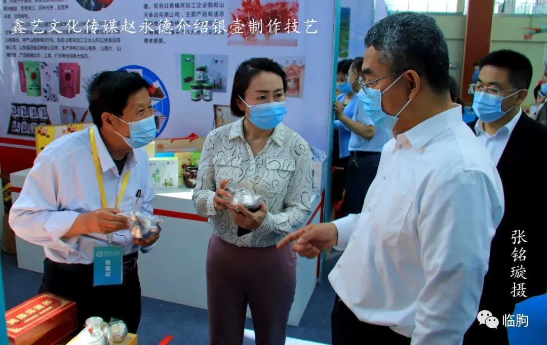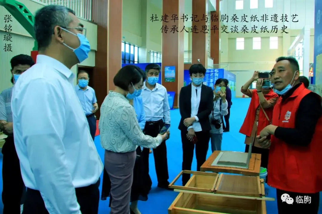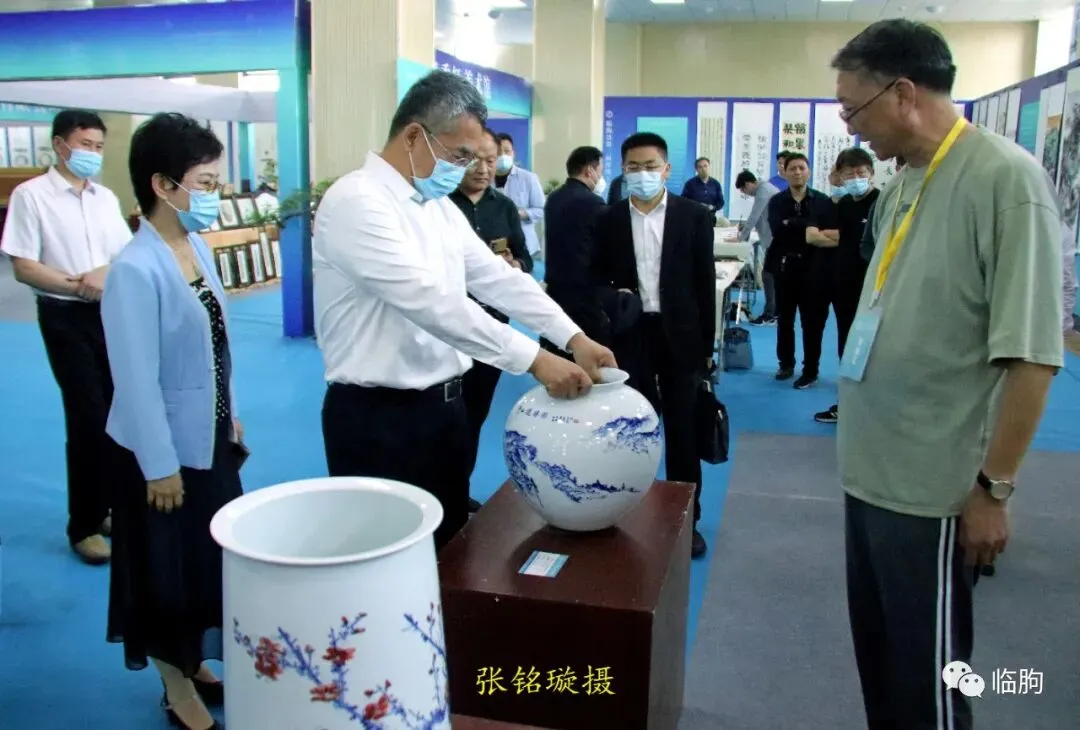 杜书记拿起手工篦子,与制作艺人交流工艺流程,并咨询市场销路。9点45分,杜书记、刘县长等来到临朐桑皮纸非物质文化遗产传承人连恩平的捞纸展区,仔细观摩连师傅的捞纸技法。刘县长还饶有兴趣地用手机拍摄连师傅的捞纸工艺。9点47分,杜书记、刘县长来到壶艺老匠人的展区,仔细观赏了老艺人的手工技法。9点49分,在黑陶展区,杜书记、刘县长参观了现代工艺仿制历史黑陶的器皿;面对一棵典雅的盆景,刘县长还摘下口罩,应邀采摘了盆景艺术品的绿叶,品味鉴赏。