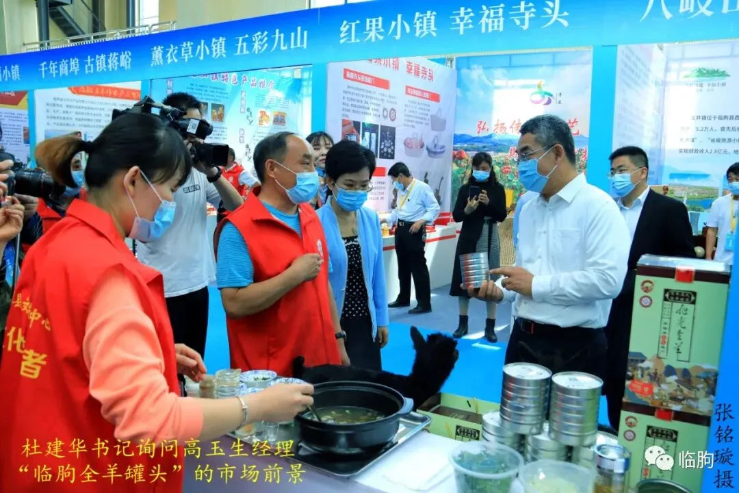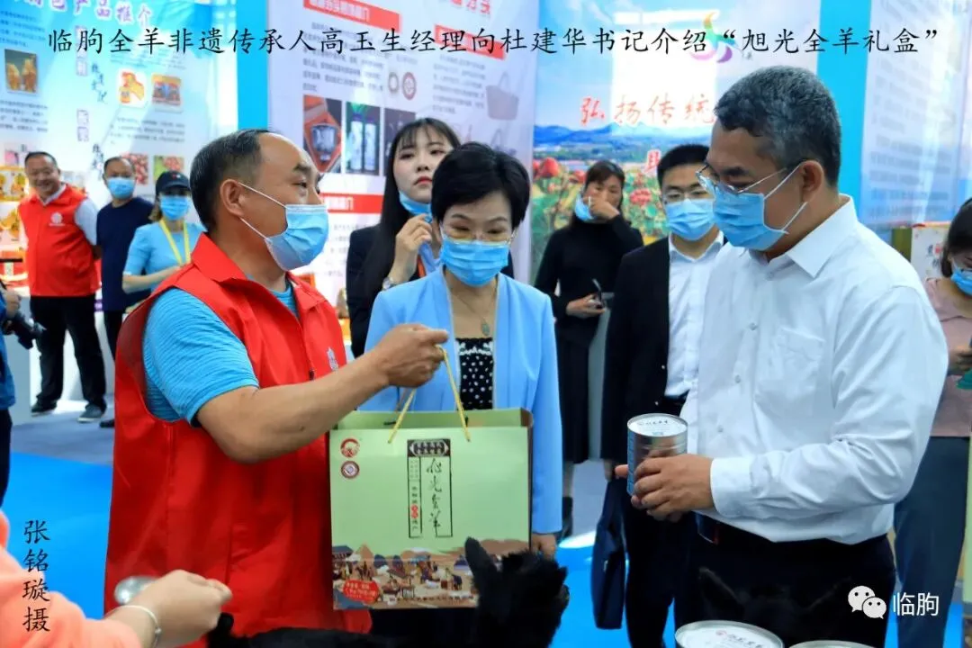 9点51分,杜书记、刘县长来到“临朐全羊”非遗传承人高玉生经理的展区,这里有熬制好的全羊汤、制作好的全羊罐头,还有全羊礼品盒。杜书记看了罐头,向高经理询问了临朐全羊的特点;高玉生经理介绍了临朐全羊的制作技艺,并拿出全羊礼品盒介绍了市场前景。