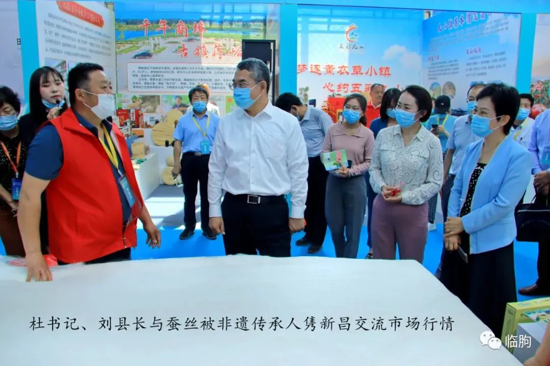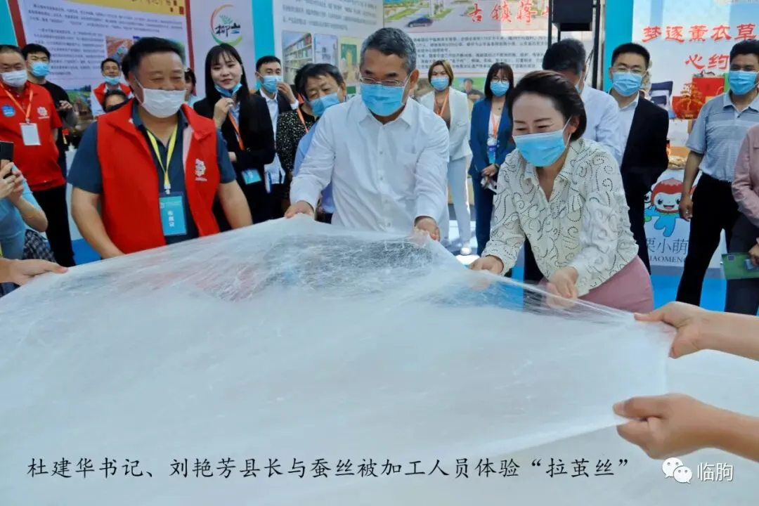 9点57分,杜书记、刘县长来到蚕丝被制作技艺展示区,向蚕丝被非遗传承人隽新昌先生咨询了蚕丝被的诸多问题,并与蚕丝被制作人员互动,亲手体验拉丝活动;刘县长、黄部长都一试身手,亲自体验了蚕丝被制作的拉丝工序。杜书记还咨询了蚕丝被的市场行情,得知隽先生将蚕丝被用礼品袋包装,促销到市场后,给予了极高的肯定。10点17分,杜书记、刘县长结束了二楼的参观。在从二楼下一楼的转折楼梯上,我与杜书记正好对视,遂咨询了去年赠他《临朐名胜志》的情况。《临朐名胜志》是齐鲁书社2004年出版的本人专著,是全面介绍临朐景点的旅游志书。