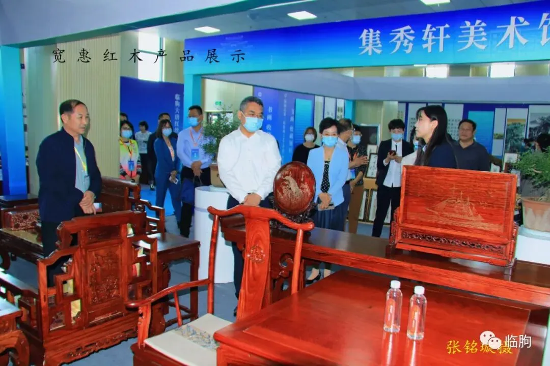 10点21分,杜书记走进宽惠红木展示区,这里全是临朐县宽惠红木的工艺品,雕刻工艺美术师马世卿向杜书记做了产品介绍。