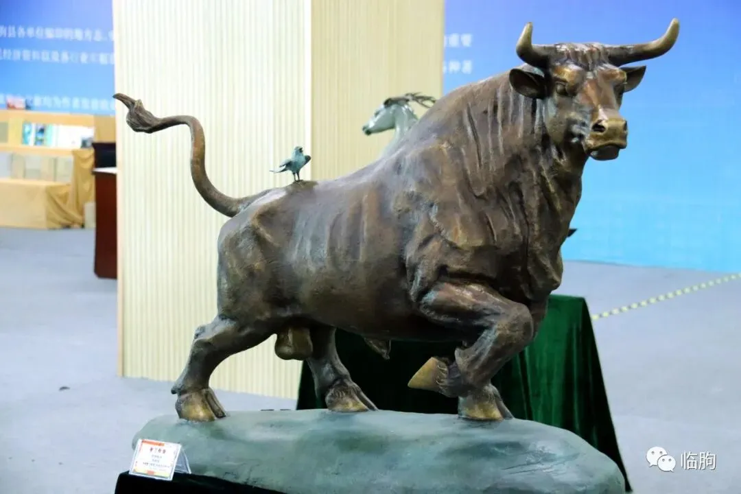 宽惠红木展区南邻是临朐华艺雕塑公司的作品,这里是中国著名工艺美术师、华艺雕塑公司总经理傅绍相先生的杰作荟萃之地,铸铜作品《羚羊》、《拓荒牛》都是难得的艺术佳作。10点29分,杜书记一行来到了书画艺术展区,参观了临朐县书法家协会的作品,张俊庆会长、刘建华秘书长进行了展示内容介绍。10点33分,杜建华书记来到中国工美行业艺术大师、山东省工艺美术大师、市级红木雕刻技艺代表性传承人刘光宝的代表作《九龙壁》前,对其雕刻工艺给予高度评价。刘光宝先生的代表作是《清明上河图》木雕,长十余米,宽半米,纯手工雕刻,采用镂雕、浮雕、立雕技法,雕刻人物近800人,是雕刻工艺界的传世力作。10点35分,杜建华书记、刘艳芳县长来到瓷器艺术展区,并听取了尹涛、侯建经理的介绍。尹涛是我高中同学,向来说话无拘无束。杜书记饶有风趣地向尹涛经理索要联系名片,尹涛同学说:“改日我给您送去!”并提议合影留念。