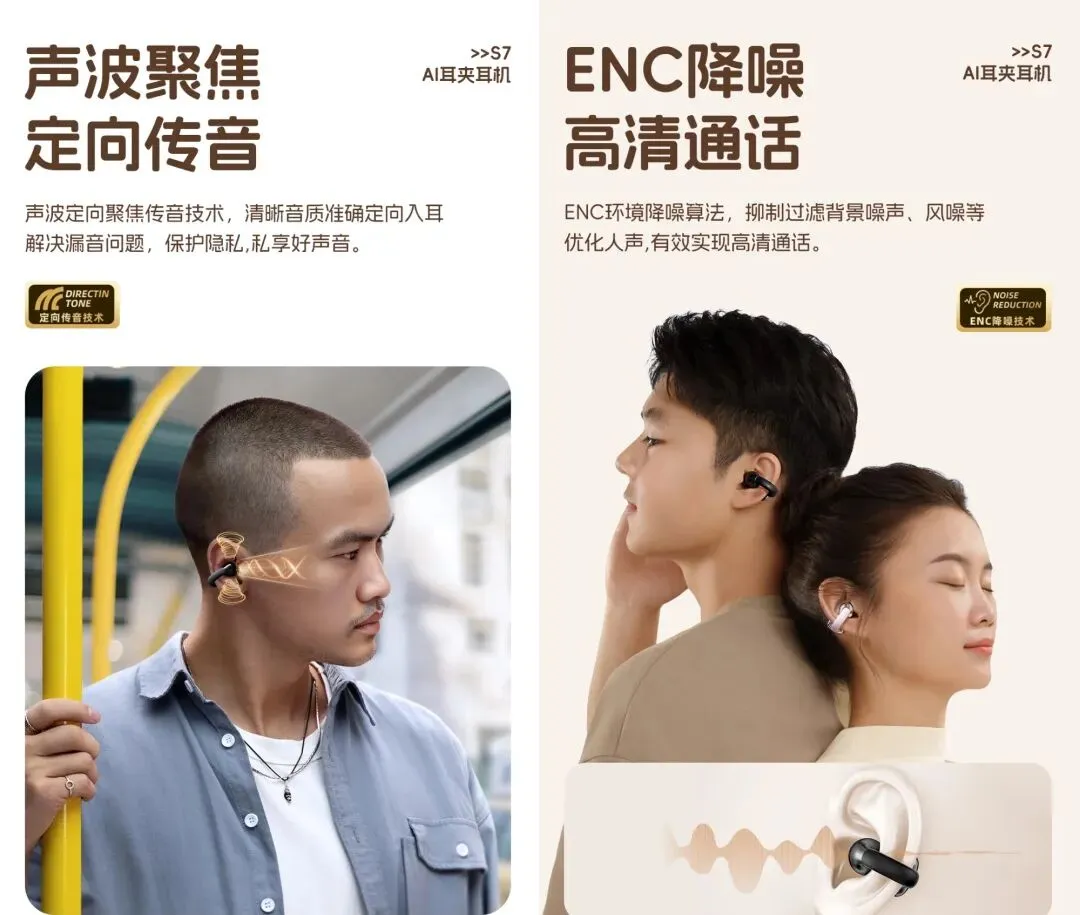 通过声波聚焦和智能过滤背景噪音、风噪,解决了市面上很多耳夹耳机听歌、通话体验差的问题!