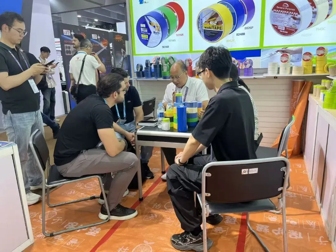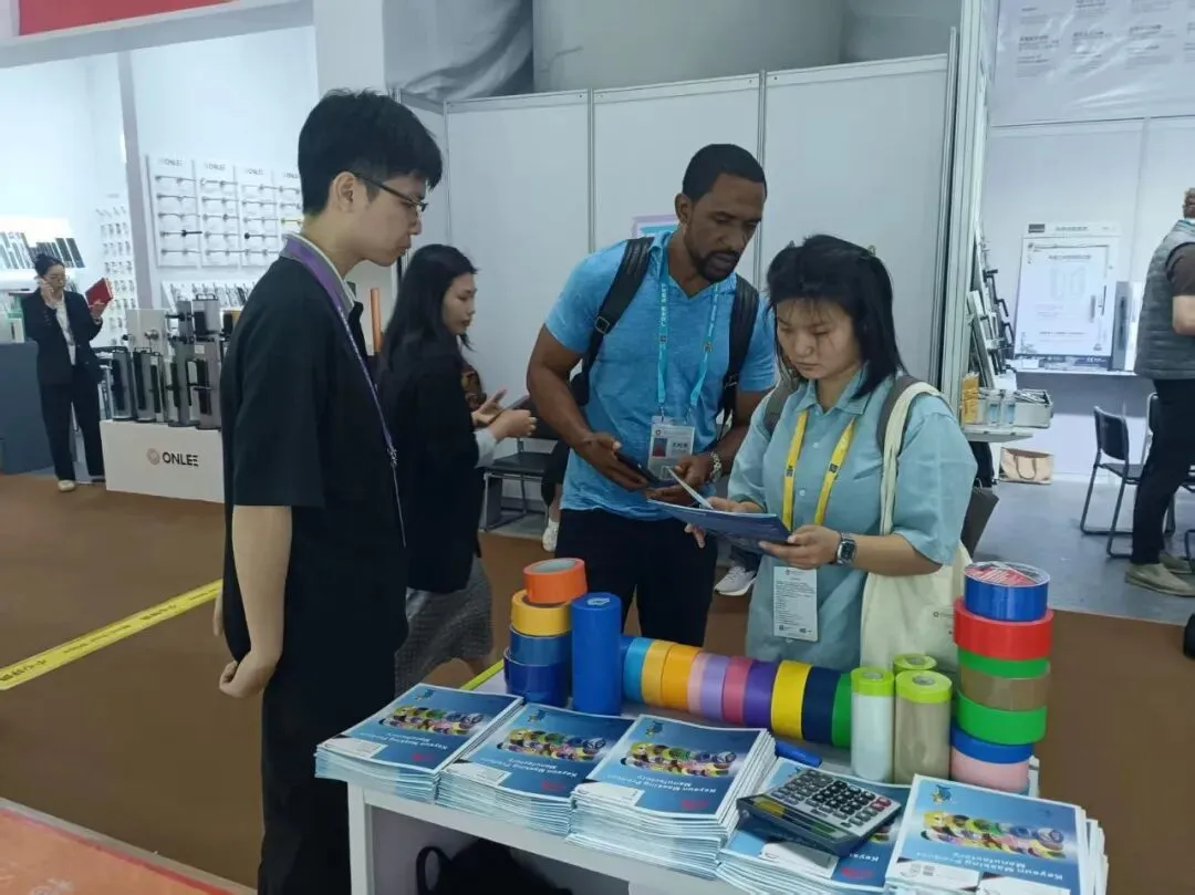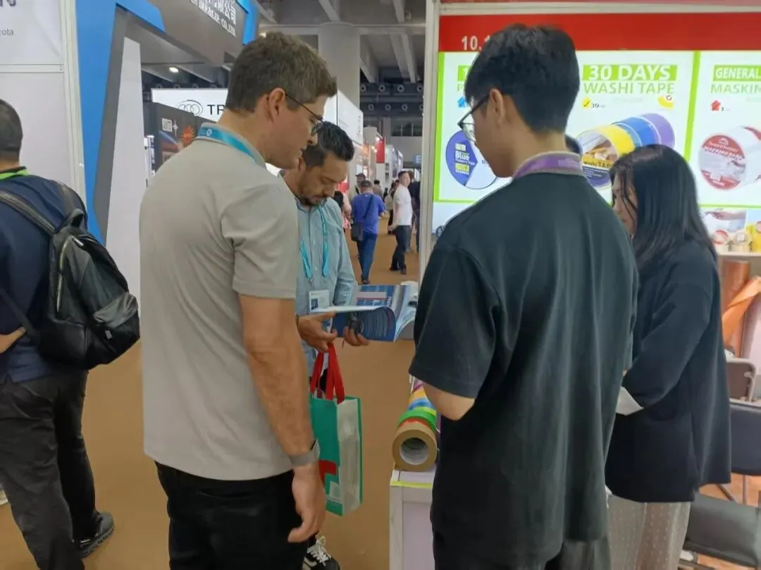 现场工作人员热情接待每一位客商,细致讲解公司的生产实力、产品优势——从1万多平方米现代化生产基地,到全自动化涂胶、复卷、分切生产线,再到全流程质量管控体系,全方位展现企业的硬核实力。客商们认真倾听介绍、亲手查验样品,围绕产品性能、规格参数、合作模式等内容展开深入沟通,现场洽谈氛围十分浓厚。