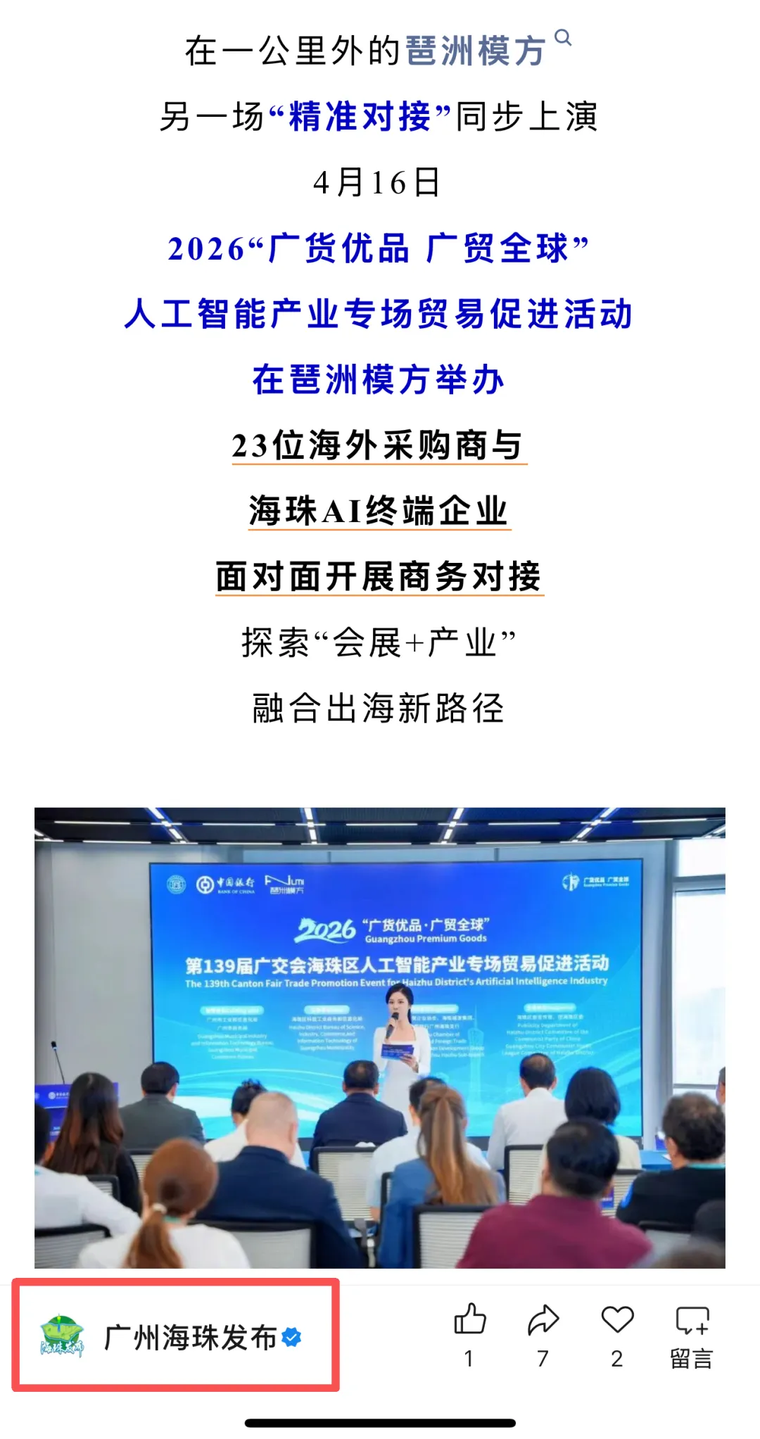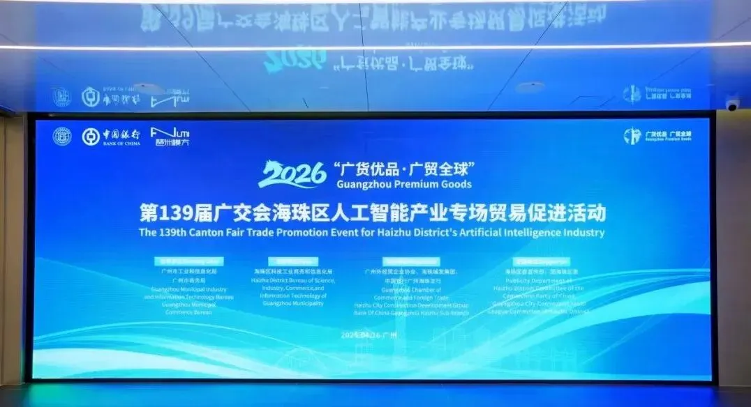 4月16日,广州市工业和信息化局、广州市商务局指导,海珠区科工商信局主办,海珠城发集团、广州外经贸企业协会、中国银行广州海珠支行承办的2026“广货优品·广贸全球”人工智能产业专场贸易促进活动在琶洲模方举办。