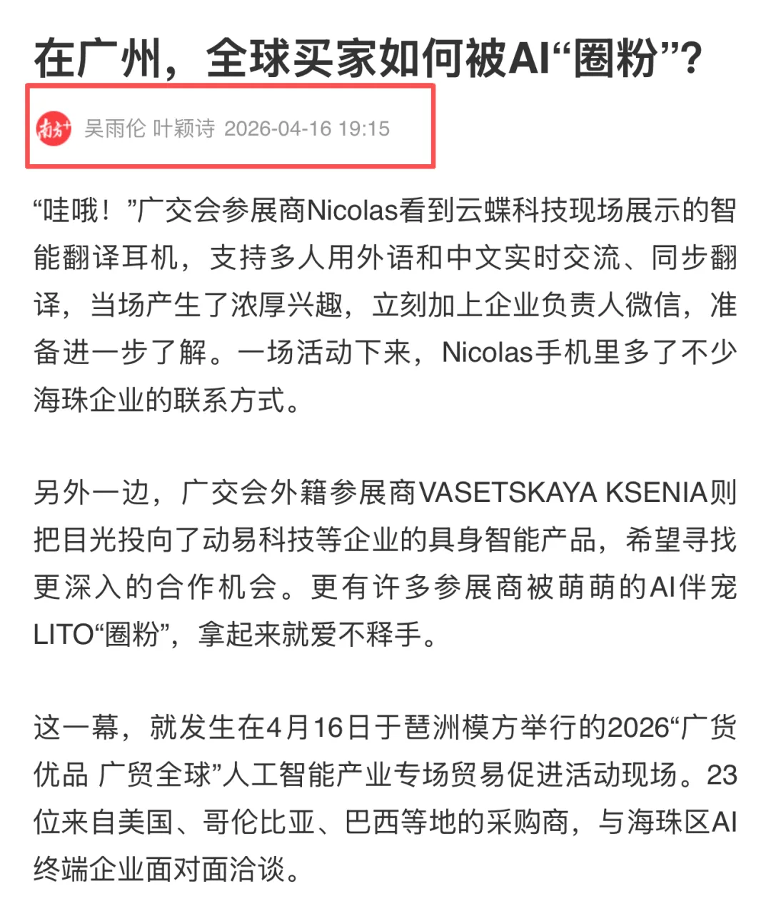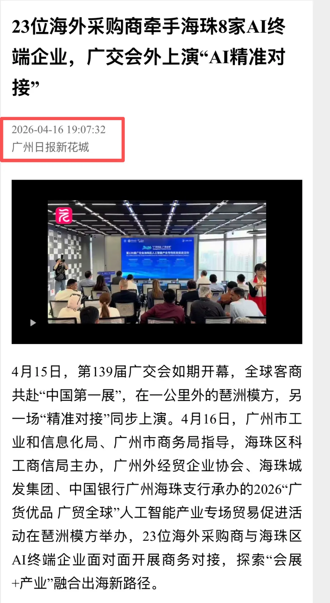 多家权威媒体聚焦此次盛会,从广州海珠发布的官方全景呈现,到南方日报笔下全球买家被智能产品“圈粉”的鲜活现场,再到广州日报关注的“流量变订单”创新模式——全方位记录了“广货优品 ·广贸全球”人工智能专场的火热场景与前沿探索。
