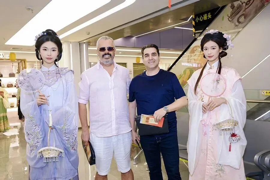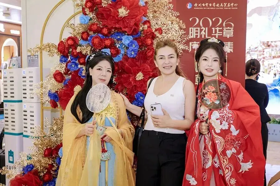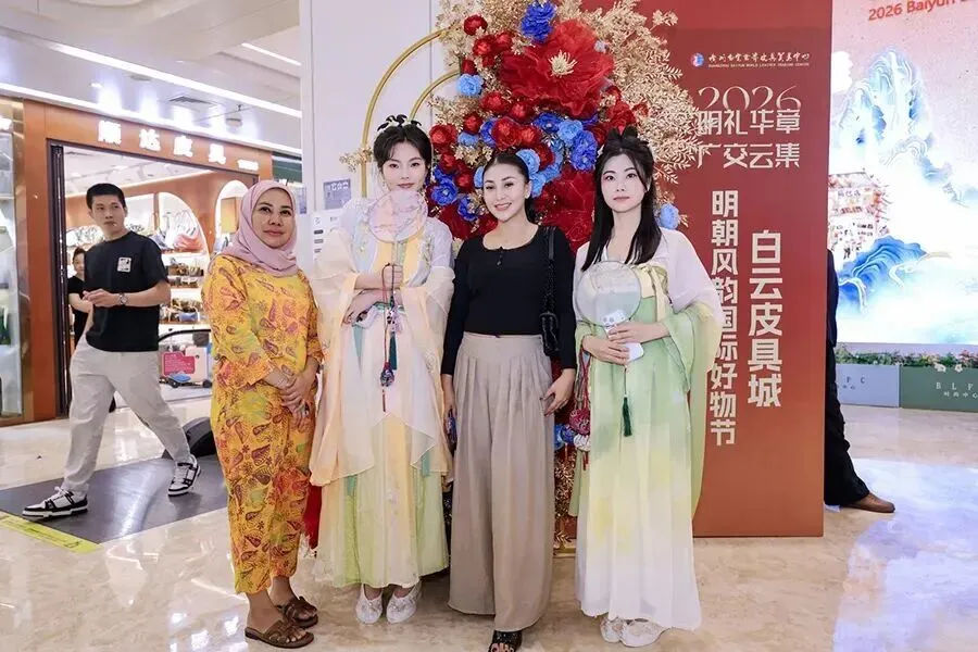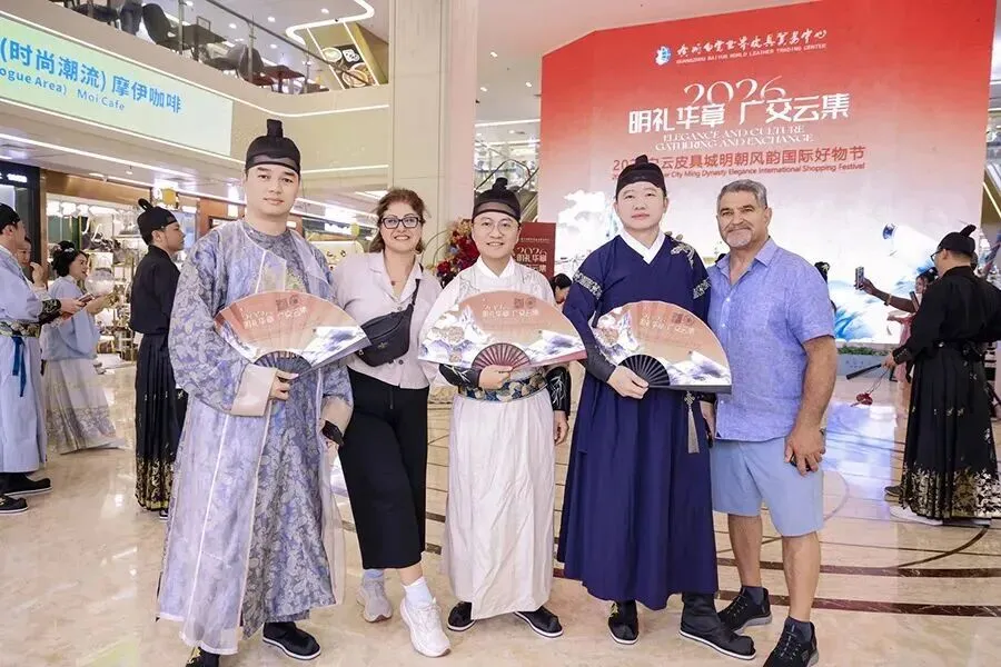 针对远道而来的来自世界各地的客商,白云皮具城特别设计了 “使节礼遇”仪式。工作人员身着明代官服,在入口举行简短而隆重的欢迎仪式,并赠送“通关文牒”——这是一份集采购指南与优惠券于一体的特色凭证。一位来自中东的采购商在接过“通关文牒”后笑着说:“感觉自己像古代的贵宾,非常特别。”
