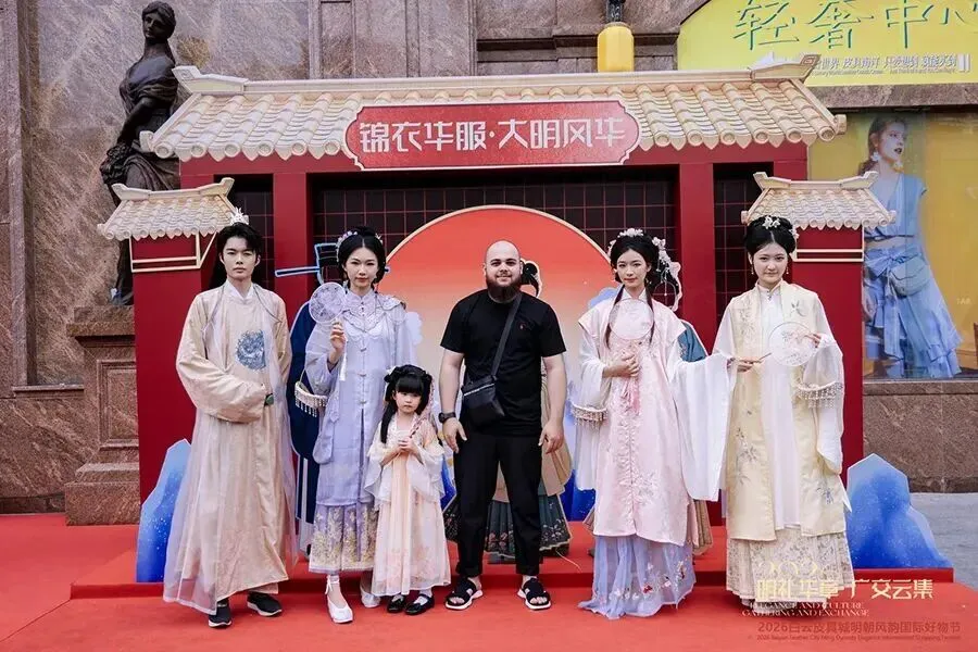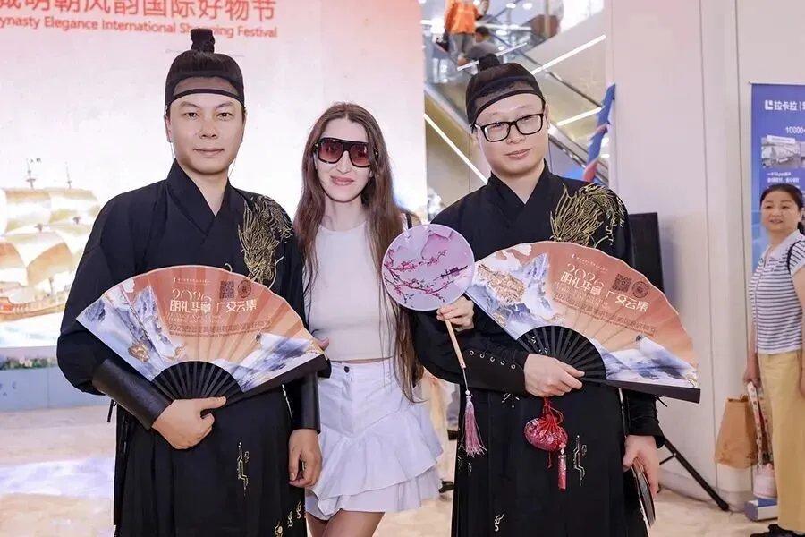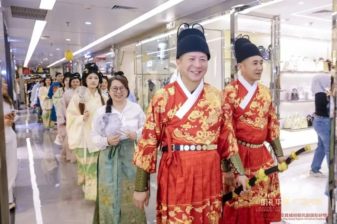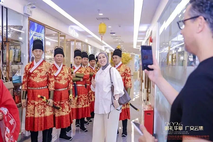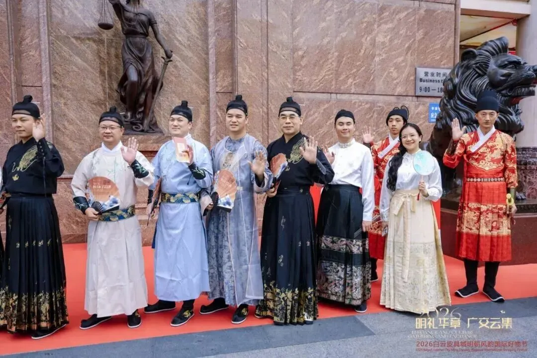 活动伊始,白云皮具城一期正门处,一座仿明代风格的“宾至门”巍然矗立,门两侧身着明服的“迎宾使”整齐列队,向每一位入场的客商行传统揖礼,致以诚挚问候。现场更有身着飞鱼服、佩戴绣春刀的“锦衣卫”方阵巡行于外广场,既是安保的象征,更化身流动咨询台,以古装形象为客商提供指引,引得不少外商纷纷驻足合影。